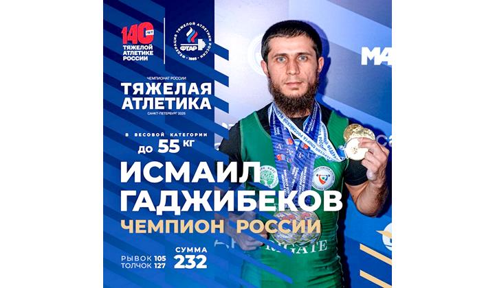 Алатай гьафтеда Санкт-Петербургда залан атлетикадай кьиле фейи Россиядин чемпионатда чи ватанэгьли Исмаил Гьажибегова 55 кг-дал къведалди заланвал авайбурун арада инанмишвилелди гъалибвал къазанмишна, уьлкведин чемпионвилин тIварцIиз гила ам 4-сеферда лайихлу хьанва. Нубатдин чемпионатда чи ватанэгьлиди, санлай къачурла, 232 кг (рывокда — 105 кг ва толчокда — 127 кг) хкажна.
