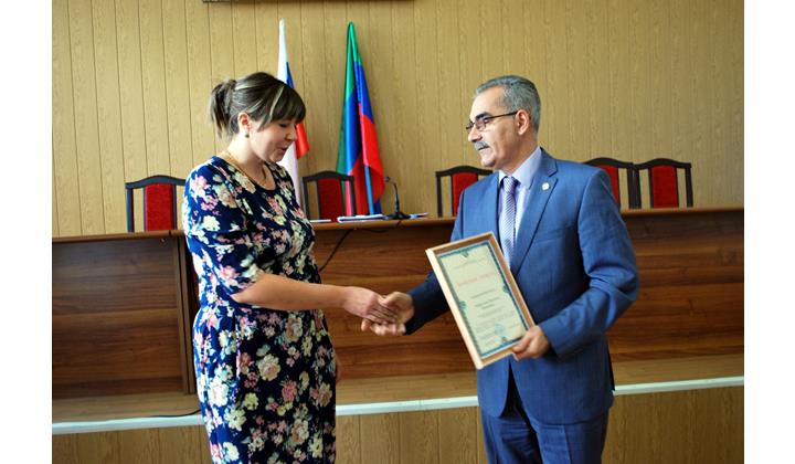 — Дагъустанвияр савадлу хьуник урус халкьдин векилри — пешекарри еке пай кутурди я, баркаллу и кардай чна абуруз чухсагъул лугьузва. — Абурукай гзафбуруз ХХ асирдин Гомер СтIал Сулейманан тIвар алай райондикай кьвед лагьай ватан хьана, абуру чпин кьисметар чи районэгьлийрихъ галаз сад авуна, кIвал-югъ, хизанар кутуна. Вилик девирра башламиш хьайи и кар Наталья Ивановна хьтин ксари чи йикъарани давамарзава, — къейдна, грамота вахкудайла, Н. Абдулмуталибова.