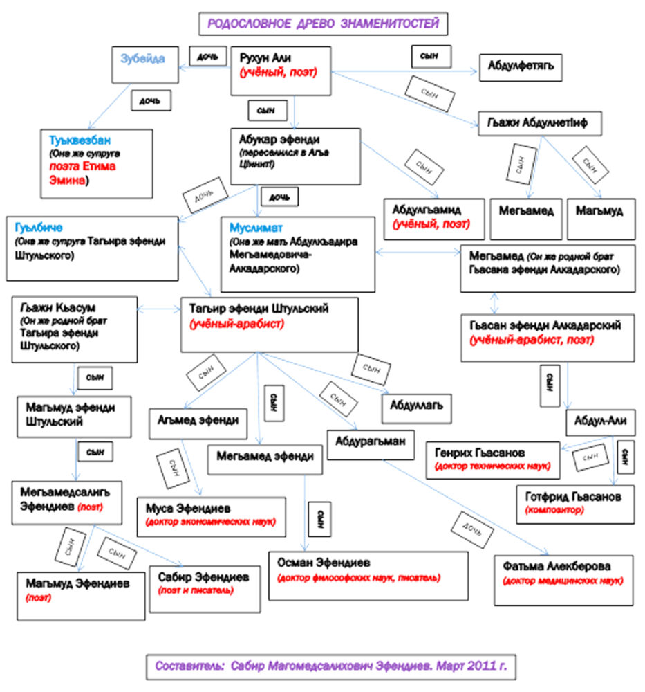 И ва маса делилар хъсандиз кьатIуз жедайвал, за 2011-йисуз Фатьма Аликберовадин тухумдинни Рухун Алидин ва маса машгьур ксарин тухумрин алакъайрикай схема арадал гъанай. Белки, и месэла итижлу жедай ксар аватIа лагьана, ам за квел ракъурзава.
