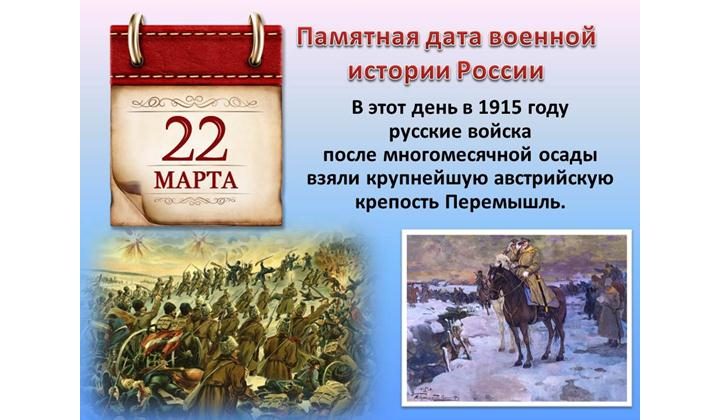 Памятная дата военной истории России. В этот день в 1915 году русские войска после многомесячной осады взяли крупнейшую австрийскую крепость Перемышль. Более подробная информация о событии по ссылке https://histrf.ru/lenta-vremeni/event…