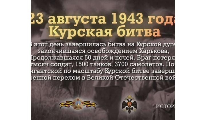В этот день в 1943 году завершилась битва на Курской дуге, закончившаяся освобождением Харькова, продолжавшаяся 50 дней и ночей. Враг потерял 500 тысяч солдат, 1500 танков, 3700 самолётов. Победа в гигантской по масштабу Курской битве завершила коренной перелом в Великой Отечественной войне.