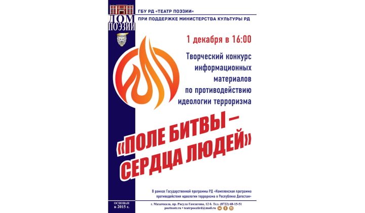 1 декабря 2020 года в 16:00 будут подведены итоги Творческого конкурса информационных материалов по противодействию идеологии терроризма «Поле битвы – сердца людей», проводимого Театром поэзии при поддержке Министерства культуры Дагестана в рамках реализации государственной программы РД «Комплексная программа противодействия идеологии терроризма в Республике Дагестан». Трансляция пройдёт на странице @teatrpoeziird в Instagram. Об этом сообщили в пресс-службе Театра поэзии.