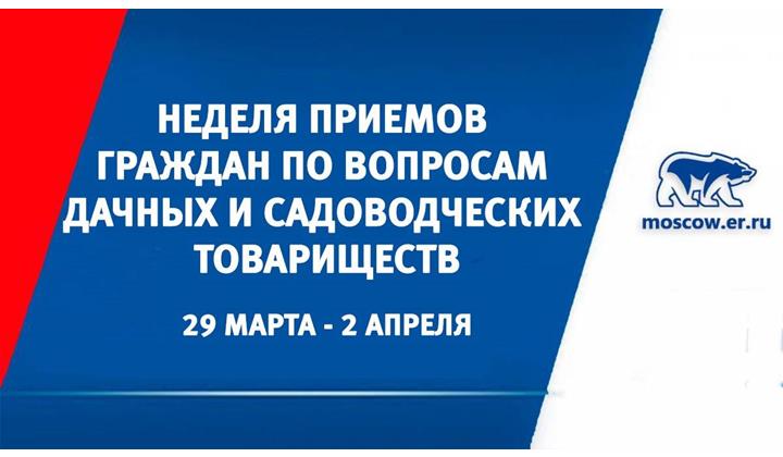Сетевое издание «Мирмол» сообщает, что с 29 марта по 2 апреля в республике депутатами от партии «Единая Россия» будет проведена неделя приемов граждан по вопросам дачных и садоводческих товариществ.