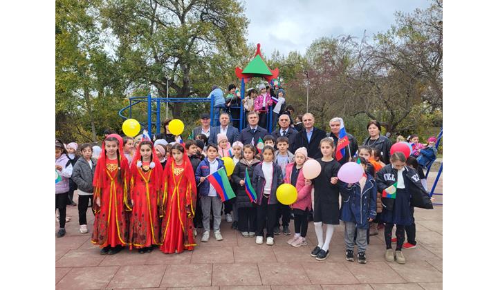 Далее почетные гости отправились на церемонию открытия детской площадки в селе Алкадар.