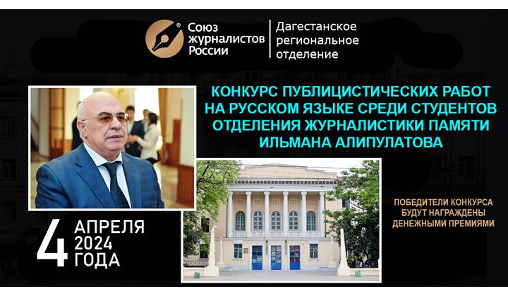 4 апреля 2024 года в рамках 65-летия со дня основания Дагестанского регионального отделения Союза журналистов России, в ДГУ пройдет конкурс публицистических работ на русском языке, посвященный памяти видного общественно-политического деятеля, журналиста Ильмана Алипулатова.