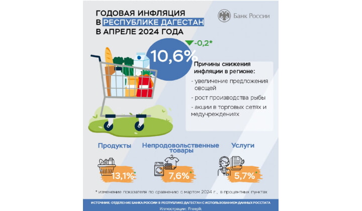 Годовая инфляция в Дагестане замедлилась в апреле до 10,6% после 10,8% в марте. Влияние на это оказал рост предложения ряда товаров на внутреннем рынке. Об этом сообщили в пресс-службе Отделения-НБ Республика Дагестан Южного ГУ Банка России.