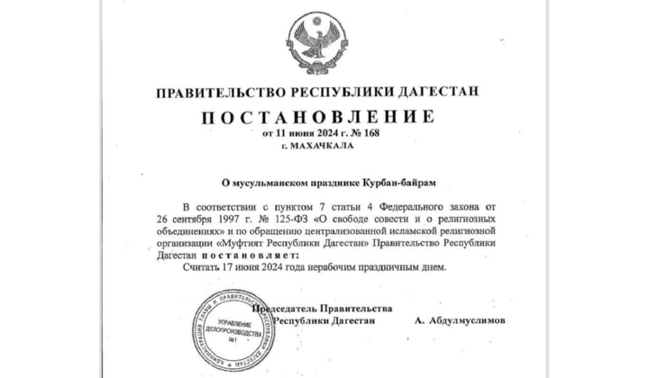 «В соответствии с пунктом 7 статьи 4 Федерального закона от 26 сентября 1997 г. N 125-ФЗ «О свободе совести и о религиозных объединениях» и по обращению централизованной исламской религиозной организации «Муфтият Республики Дагестан» Правительство РД постановляет: Считать 17 июня 2024 года нерабочим праздничным днём»,- говорится в постановлении, подписанном премьер-министром.