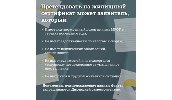 Претендовать на получение жилищного сертификата может заявитель, который: имеет подтвержденный доход не ниже МРОТ в течение последнего года; не имеет задолженности по налогам и сборам; не имеет психических заболеваний, зависимостей; не имеет судимостей и не подвергался уголовному преследованию за умышленное преступление; не находится в трудной жизненной ситуации. Документы, подтверждающие данные факты, запрашиваются Дирекцией самостоятельно.