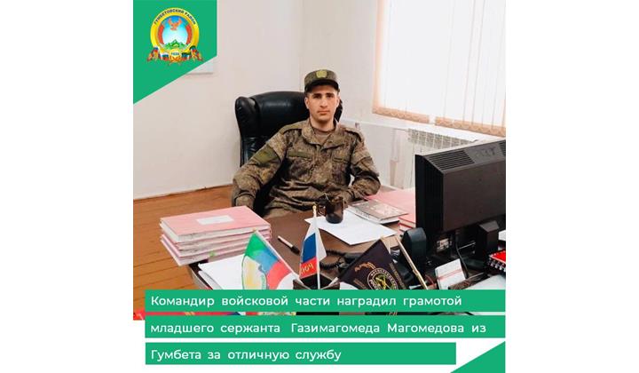 За безупречную срочную службу командир войсковой части П. Белкин наградил грамотой младшего сержанта Газимагомеда Магомедова из Гумбетовского района.