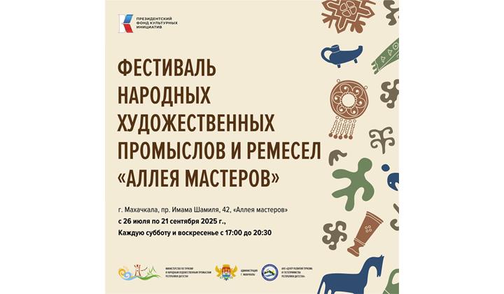 26 июля в Махачкале стартует фестиваль народных художественных промыслов и ремёсел «Аллея мастеров». Площадкой для проведения мероприятия станет проспект Имама Шамиля, 42.