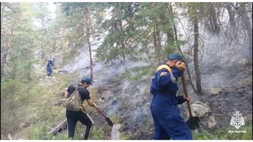 Тушение осложняется труднодоступной местностью, отсутствием возможности подъезда спецтехники и порывами ветра свыше 10 м/с.