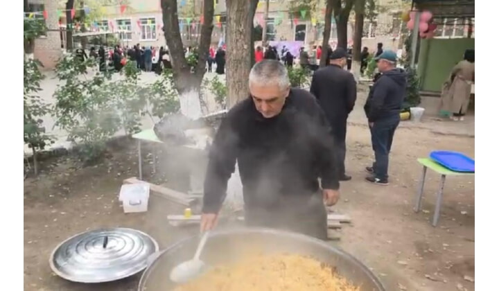 В 4 часа утра меценат привез во дворе учреждения свой огромный казан, продукты, дрова и в буквальном смысле устроил кулинарное волшебство с приготовлением плова на дровах. Рядом неизменно установил огромный самовар, тоже на дровах. Перед ароматом горных трав никто не может устоять.
