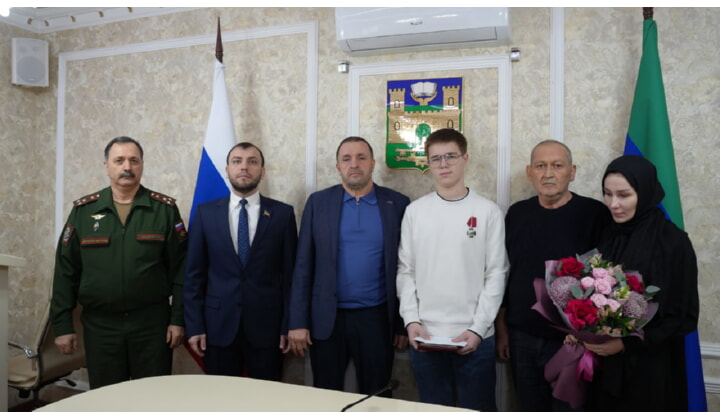 В Администрации Хасавюрта прошло мероприятие по передаче ордена Мужества родным погибшего участника специальной военной операции Арслана Кабаева. Глава Хасавюрта Корголи Корголиев совместно с Председателем городского Собрания депутатов Хаджимурадом Умахановым передали государственную награду сыну погибшего бойца — Багаудину Кабаеву. Об этом сообщили в пресс-службе администрации МО «город Хасавюрт».