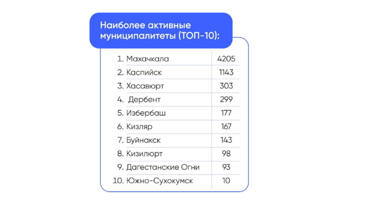 Среди муниципальных образований наибольшее число обращений зафиксировано в Махачкале — 4 205, Каспийске — 1 143 и Хасавюрте — 303.