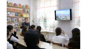 По ходу вечера детьми был просмотрен видеоряд родного села поэта сел.Микрах с красивыми природными пейзажами и горами и достопримечательностями района.