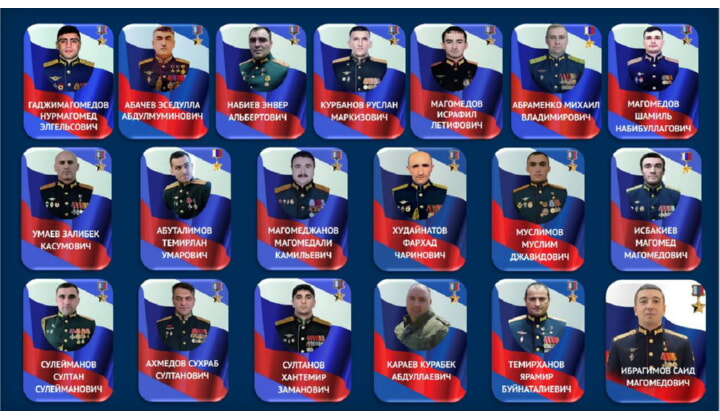 Это генерал-лейтенант Сухраб Султанович Ахмедов, майор Султан Сулейманович Сулейманов (посмертно), подполковник Хантемир Заманович Султанов, полковник Курабек Абдулаевич Караев, полковник Ярамир Буйнаталиевич Темирханов, подполковник Саид Магомедович Ибрагимов.
